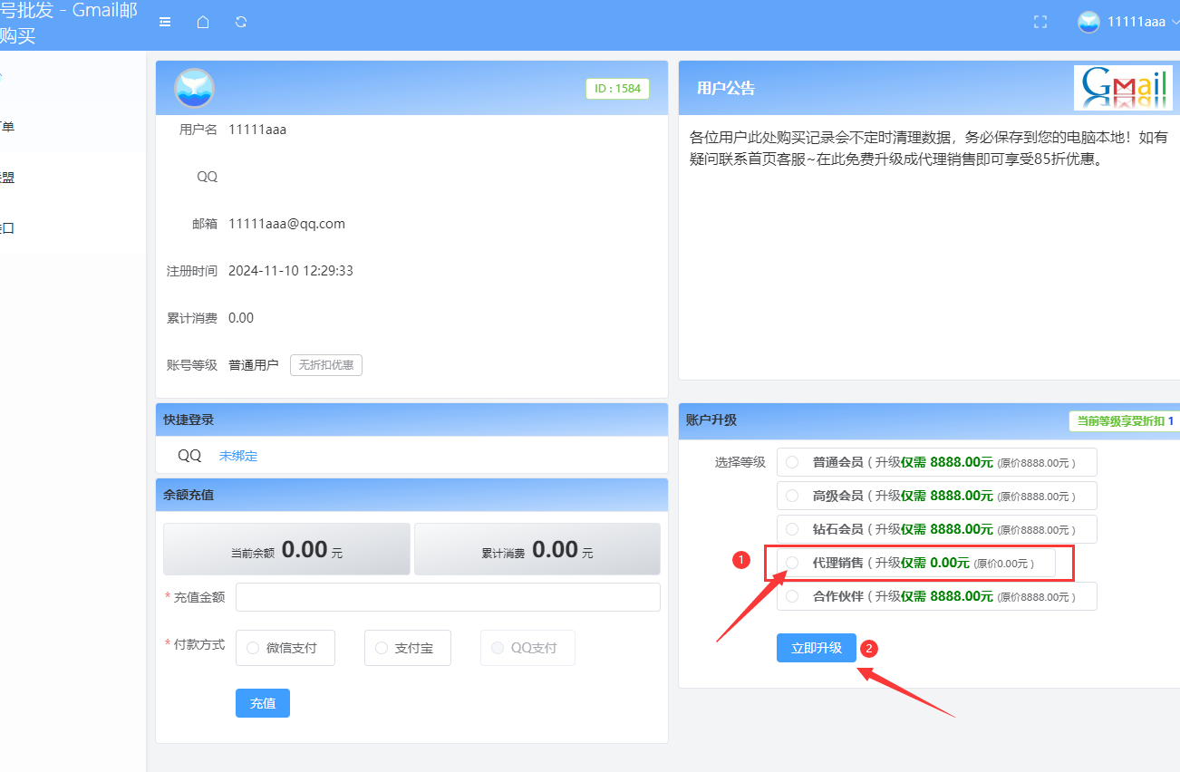 3.成功进入会员中心后按照箭头指示免费升级代理销售